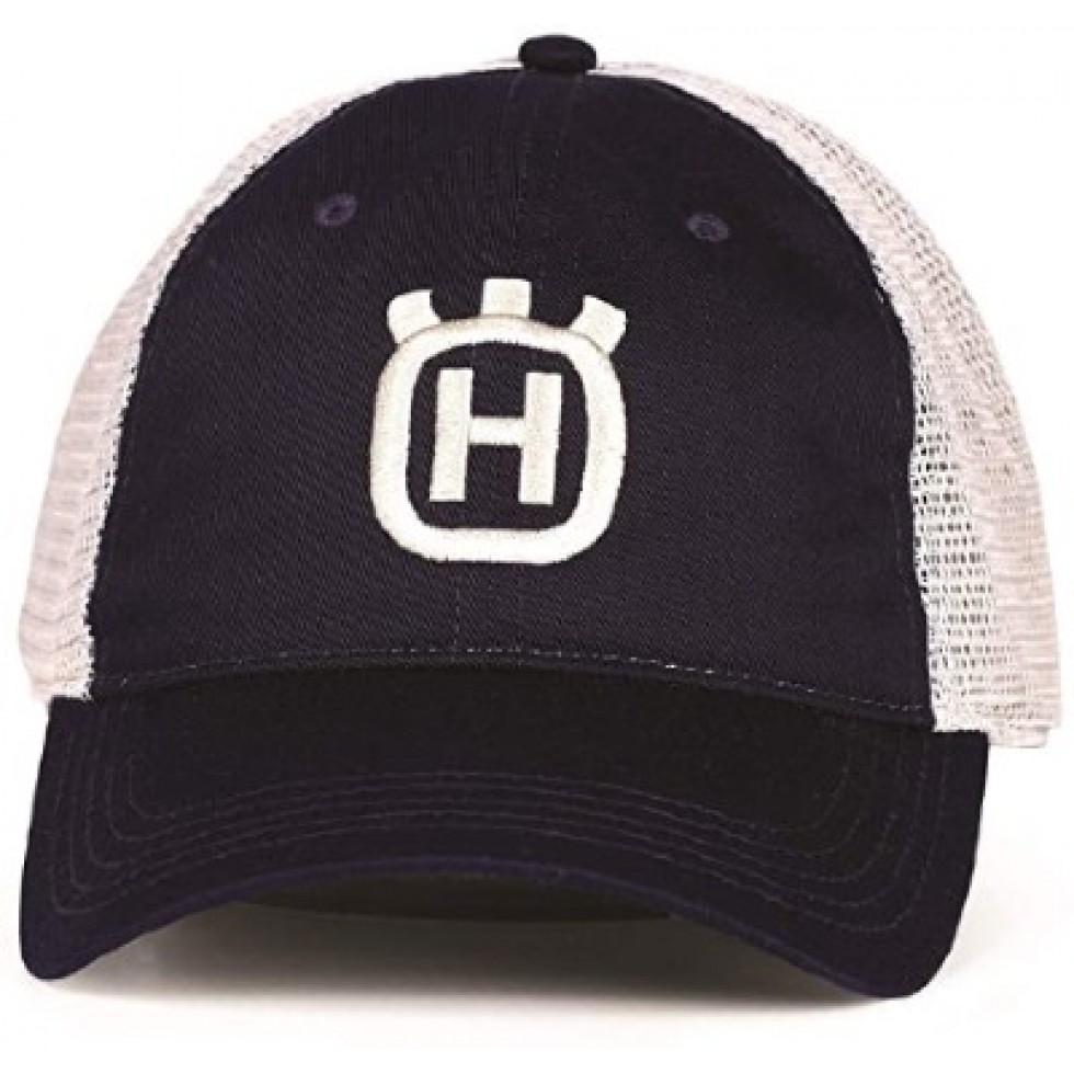 Casquette à bas profil à 6 panneaux non structurés. Croisé marine 65% polyester et 35% coton. Filet camionneur délavé 100% polyester. Fermoir plastique à pression. Broderies plates.